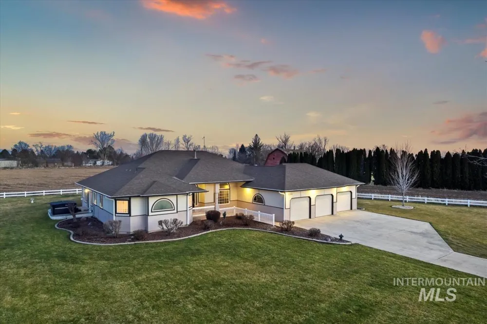Set on 5.2 beautiful acres in Eagle’s Buckhorn Estates, this well-built single-level home offers space, privacy, and comfort with room for animals and outdoor living. The open floor plan is anchored by a spacious kitchen that flows into separate living and family rooms, along with a formal dining area—ideal for everyday living and entertaining. The primary suite is a private retreat featuring dual walk-in closets, dual vanities, a jetted soaking tub, and a walk-in shower. Major recent upgrades provide peace of mind, including a new roof, new HVAC system, new well pump, new rain gutters, and a reverse osmosis water filtration system. The east-facing backyard captures peaceful foothill views and is perfect for enjoying Idaho sunrises from two large decks. Outside, the-fenced property features mature landscaping, fruit trees, an orchard, and open pasture suitable for horses, goats, chickens, or other livestock. A 12x28 storage shop/shed offers space for equipment, hobbies, or additional storage. Located in a great neighborhood with wide-open space and stunning views, this property blends the freedom of acreage living with the convenience of Eagle—an exceptional opportunity to own a truly versatile Idaho homestead.