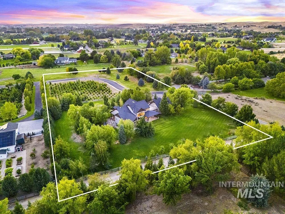 At the end of a quiet cul-de-sac, this Eagle acreage estate offers a rare blend of lifestyle & investment: a grand & spacious residence paired with a thriving truffle orchard of 250+ trees. Planted in 2019, the orchard is approaching production, with the potential for significant annual income & the unique joy of truffle farming – a pursuit long celebrated in Europe. Imagine hosting your own “truffle hunt,” followed by elegant dinner on the terrace overlooking your land. The 6,450 SF home is rich in rustic-European character, featuring arched double doors, a two-story great room with stone fireplace, and walls of windows framing the grounds. Multiple patios, porches, and an elevated terrace create seamless indoor-outdoor living, while an attached, finished space offers versatility for entertaining, ADU, creative studio, or business headquarters. With spacious suites, main-level primary, a bonus room, and flexible quarters connected by breezeway, this property provides unmatched potential & opportunity.