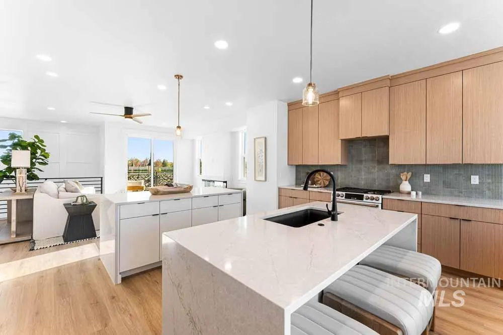 Presenting the signature model home of Molinari Park, showcasing the most elevated finishes in the community and setting the benchmark for luxury living in downtown Eagle. This thoughtfully designed residence features wide plank wood flooring, upscale wall treatments, 8-foot doors, 9-foot ceilings, and a designer lighting package throughout. The expansive open-concept second level is flooded with natural light from oversized windows and offers seamless indoor-outdoor living with two private balconies. The designer kitchen makes a bold statement with dual waterfall quartz islands, ceiling-height frameless cabinetry, and the community’s most upgraded stainless steel appliance package. Open living and dining spaces are anchored by a sleek modern fireplace, while a striking custom accent wall welcomes you from the ground level. The ground level includes a private bedroom with exterior entrance, en suite bath, and walk-in closet, ideal for guests, a home office, or flexible living space. Upstairs, three additional bedrooms include a luxurious primary suite featuring exposed wood beams, a custom accent wall, and a spa-inspired bath with a massive frameless glass walk-in tiled shower and dual-sink vanity. Community amenities include a dog park and curated landscaping, all within walking distance of Eagle’s best attractions.