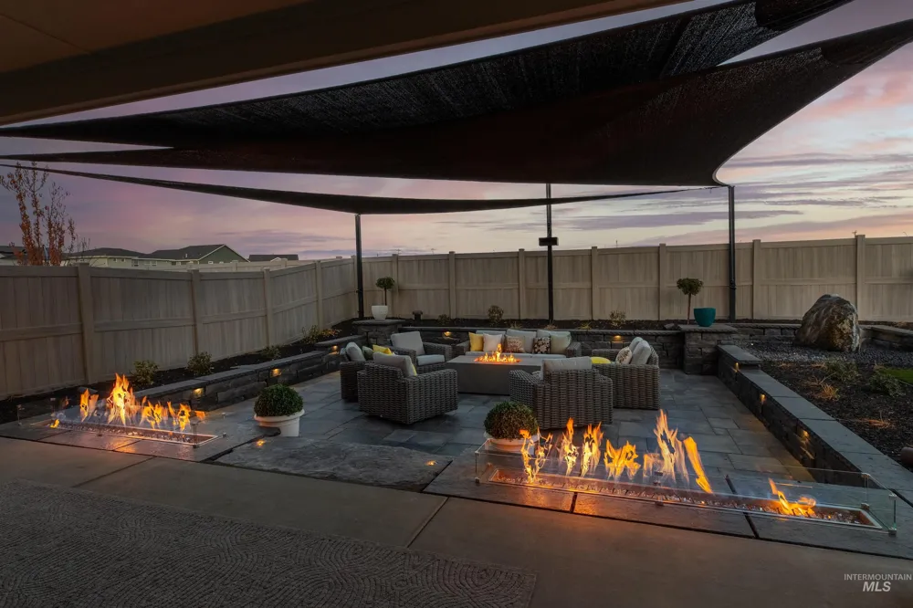 LIKE NEW! Well maintained w/RV garage & STUNNING backyard! Outside, greeted by quaint courtyard & entering in to bright, refreshing space. Kitchen boasts TONS of cabinetry inc serving station area, large quartz island/bkfst bar, LG appliances inc fridge, 5 burner cook top, RO water at sink, dual ovens & pantry w/auto on/off & lighted lower shelving for lots of storage & even a view to the mountains out the back! Plantation Shutters, newer plush carpet, coved ceilings & upgraded ceiling fans throughout. Great Rm w/cozy gas fireplace & tons of natural light. Primary w/door to patio wired for hot tub, ceiling fan & blackout blinds. Dual vanities, tiled floors, freestanding tub, tiled walk-in shower, walk-in closet & private water closet make this a lovely retreat. Easy-care LVP throughout entry, great rm, kitchen & office. Bonus/office w/double doors, great light & door to extended patio. Secondary bedrm w/walk-in closet. Secondary bath dressed in full tile & soaker tub. Mudbench drop-zone. Water softner, air purifier, laundry rm w/sink & tons of counterspace. Retreat to the backyard & relax! Lg covered patio leads to sunken conversation area w/dual gas fire wall feature. Shade sails for summer & even a bubbling rock fountain add to the comfort. Raised planter bed+SUPER EASY artificial turf! Sandy area for dogs. Finished 45' RV garage w/easy care epoxy floors for all the toys!
